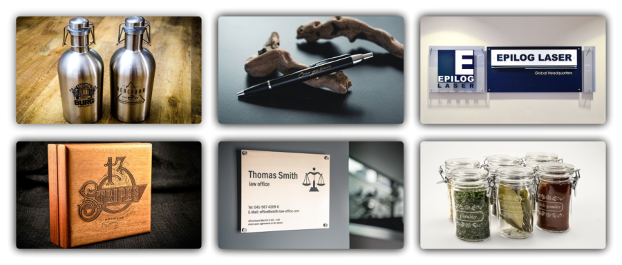 Exempel på vad vi vanligtvis graverar inkluderar kundloggor på termosmuggar, pennor och namnskyltar.